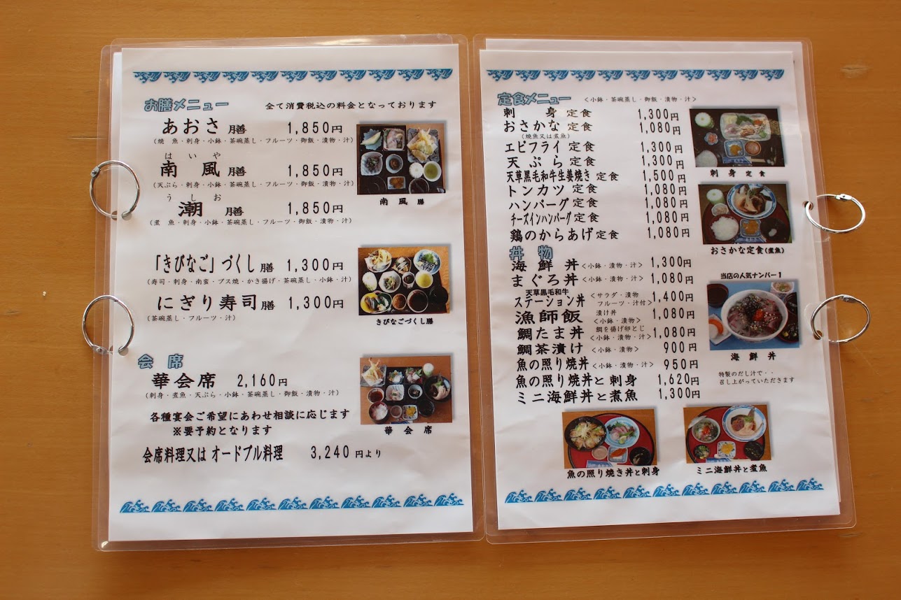 メニューには、旬の食材をふんだんに使った「あおさ膳」「南風(はいや)膳」「潮(うしお)膳」などの御膳メニューが並びます。そのほか、定食や丼物、予約限定の団体ランチメニューも用意されています。