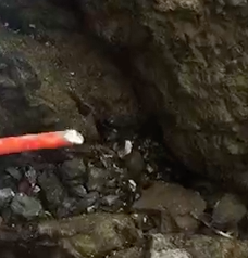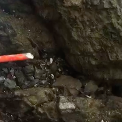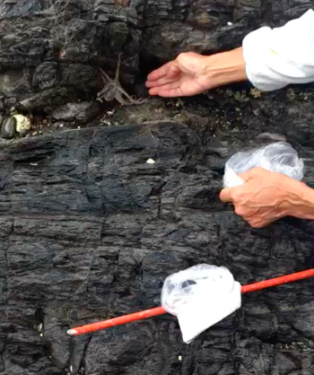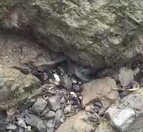 海にある岩場の断層の隙間を見ていきます。タコは貝を餌とし、タコが食べたとされる貝殻が穴の周りに落ちていればチャンス!