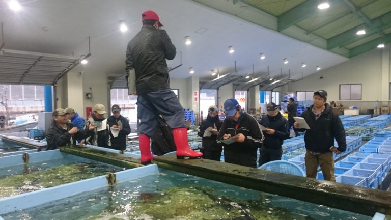 このバケツごとで目方を測るわけですが、そこは漁師さん達、手慣れた動きでサクサクと進めていきます。