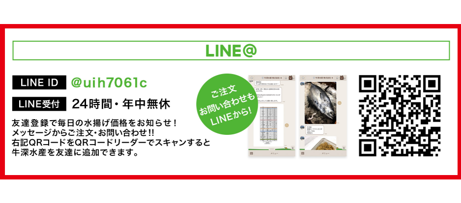 牛深水産のLINE@にご登録いただくと、毎朝最新の水揚げ情報が届きます。