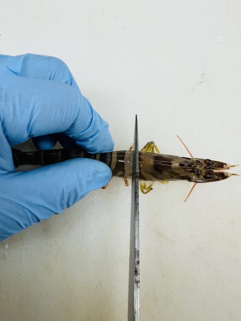 1.車海老の頭と胴体の部分を切り離します(頭と胴体の付け根に包丁を入れると簡単に切り離せます)。