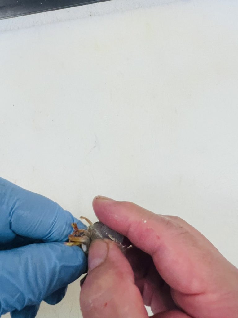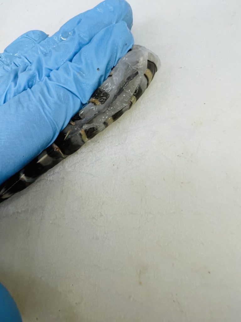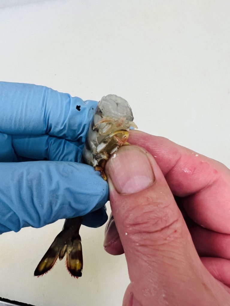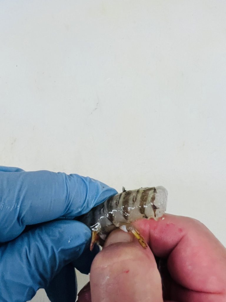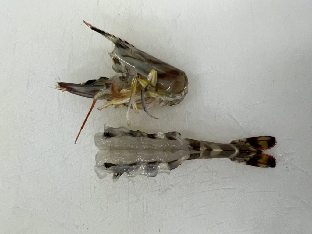 2.頭と胴体を切り離したら親指を使い、胴体の頭側の方から足と殻を順番に剥いていきます(親指を使うと簡単に剥けます)。