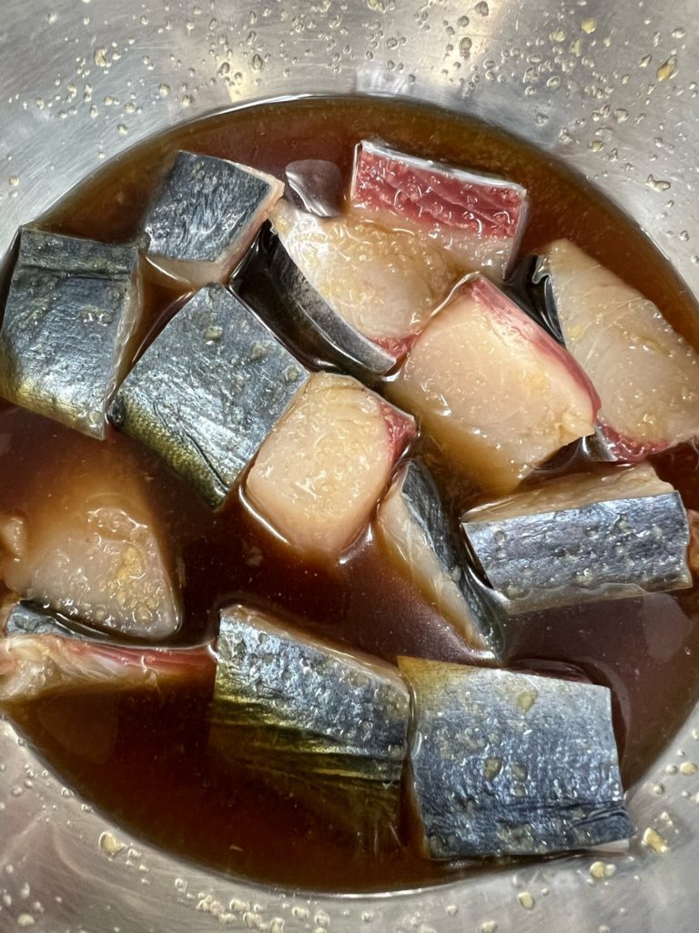 - 醤油、酒、おろしニンニクを合わせた調味料に30分程漬け込む。