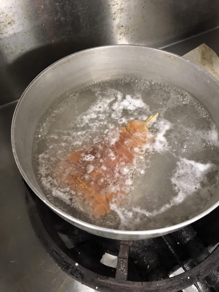 - ウチワエビに串を打つ。(焼いた時に曲がりを防ぐため)