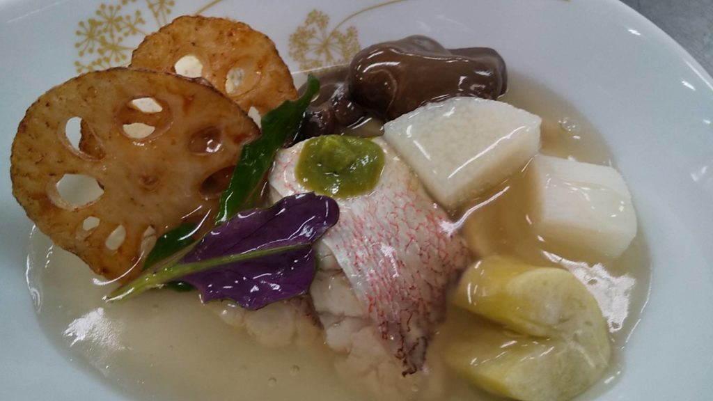 - アマダイと野菜を器に盛り、残った汁とダシを合わせて薄口醤油、ミリンを入れて銀餡を作り上からタップリと掛けワサビを天盛りして完成。
