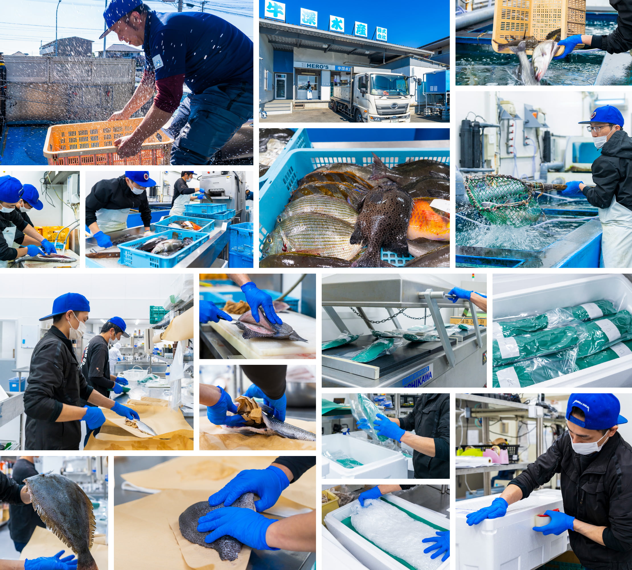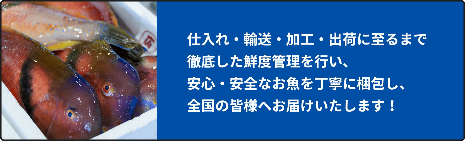 漁師との直接提携や牛深水産の確かな目利きで高品質鮮魚を選別。水揚げ後の丁寧でスピーディーな活き締め・神経締め処理で鮮度を最大限に保ちます。